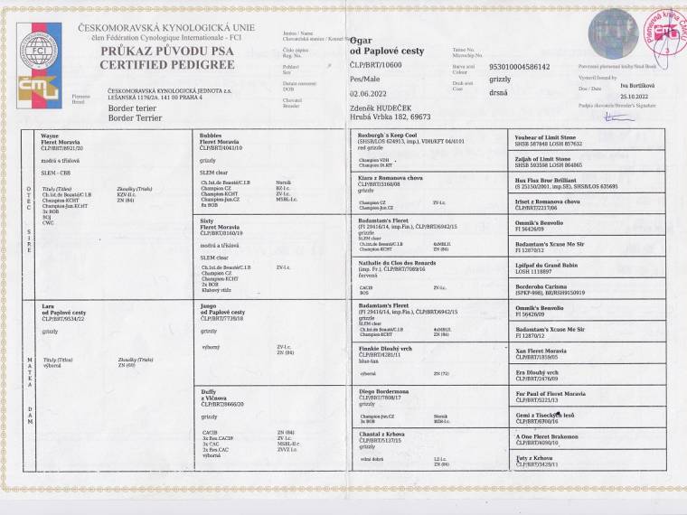 | 22.06.2024 | Mezinárodní (CACIB) Brno/CZ | Jens Ruck/A | šampionů | V1, CAC, CACIB, BOS /9 b. |