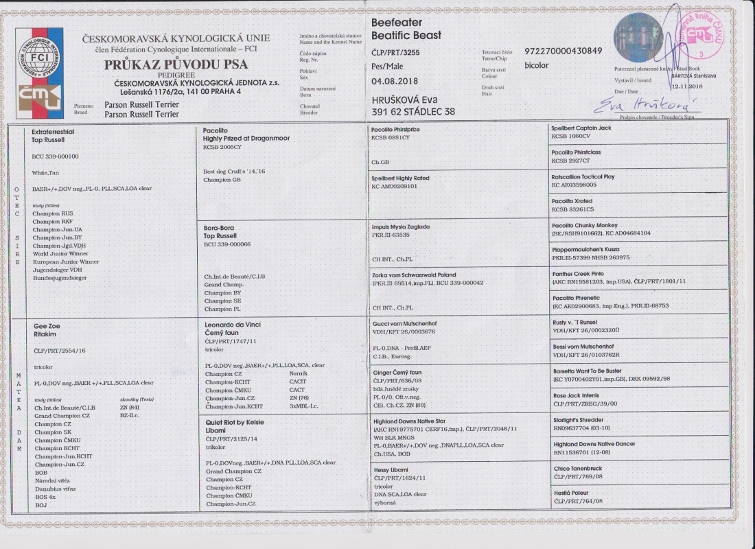 2x Vít.třídy, 2x CAJC, 3x CCJ,CC,3xCAC, r.CACIB,CACIB, Jugendhund Sieger, Klubový vítěz mladých, JCH CZ, JCH KCHT,CH CZ