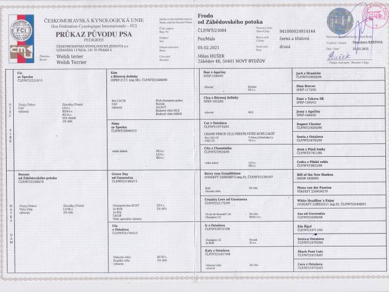 velmi dobrý, výborný,GRAND CH CZ, CH CZ, CH ČMKU, 3xBOB, 3xBOS, 3x NV, 3xCACIB, 3x r.CACIB, 9x CAC, 2x r.CAC, 7x Vítěz třídy, 7x Krajský vítěz, VTM